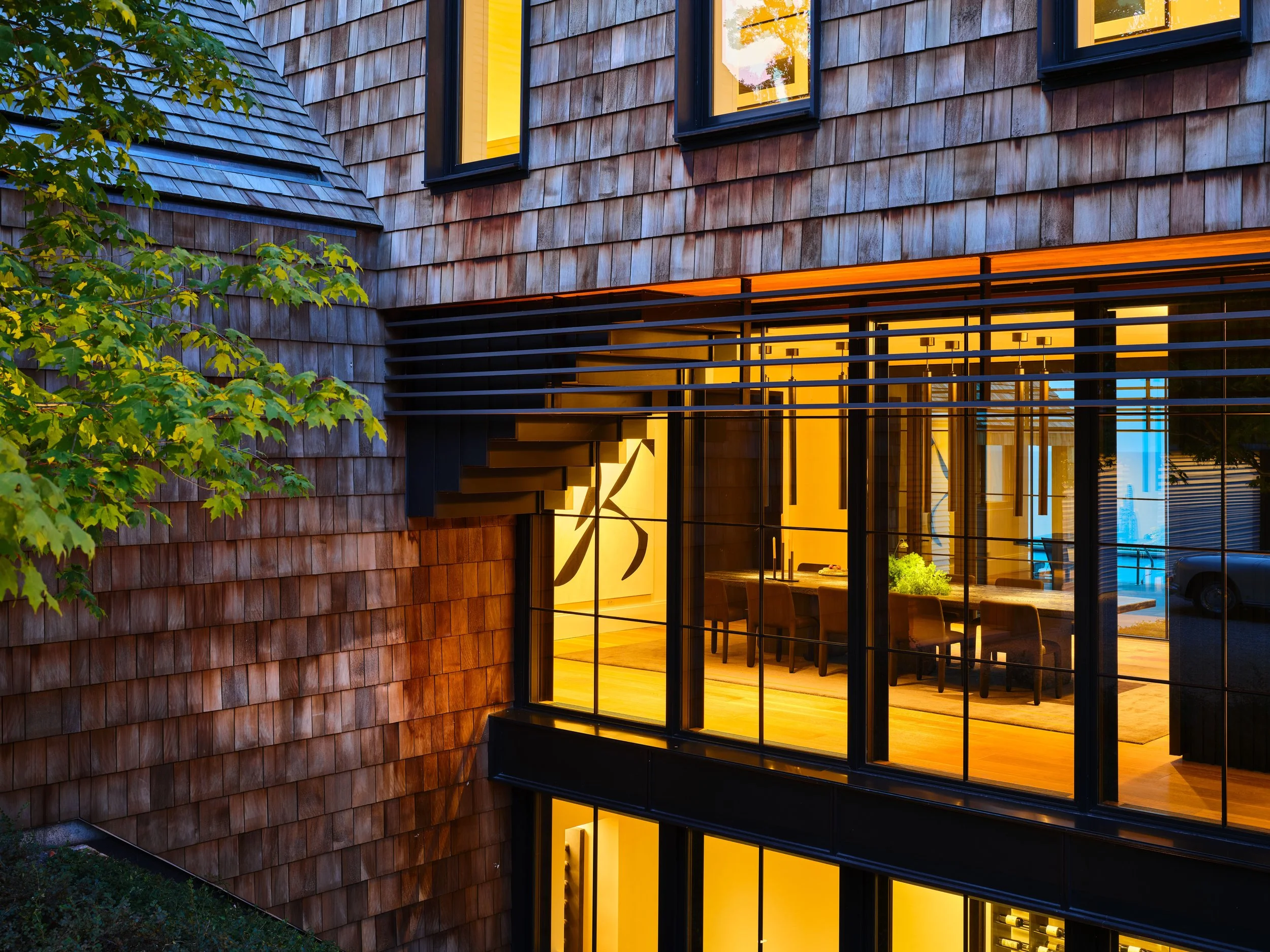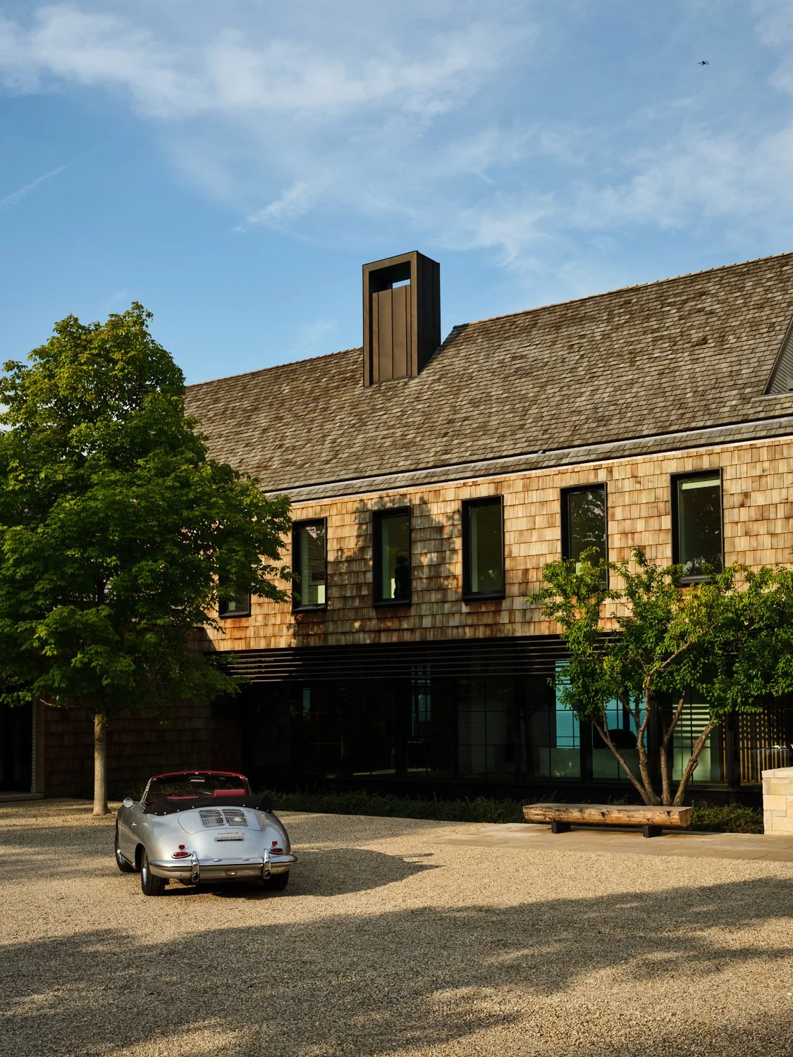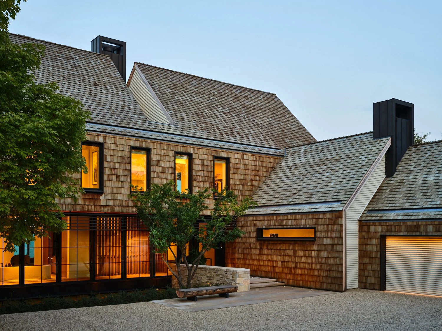 The material palette was kept intentionally modest - common oak, cold rolled steel, western red cedar, painted lap siding, patinated zinc, simple yet resilient ceramic and porcelain. These materials were then combined and detailed with careful intent, befitting the character of the home. That said, the details and materials speak softly to avoid overshadowing the magnificent land and water beyond.The home’s classic gables and shingle style skin recognize neighboring landmark estates designed by the likes of David Adler, Robert Seyfarth, and Charles Bernard Shaw. With that historic acknowledgment established, a series of gestures such as a pair of chimneys that boldly slash through the principal roof subvert convention, firmly planting the house in the contemporary age.