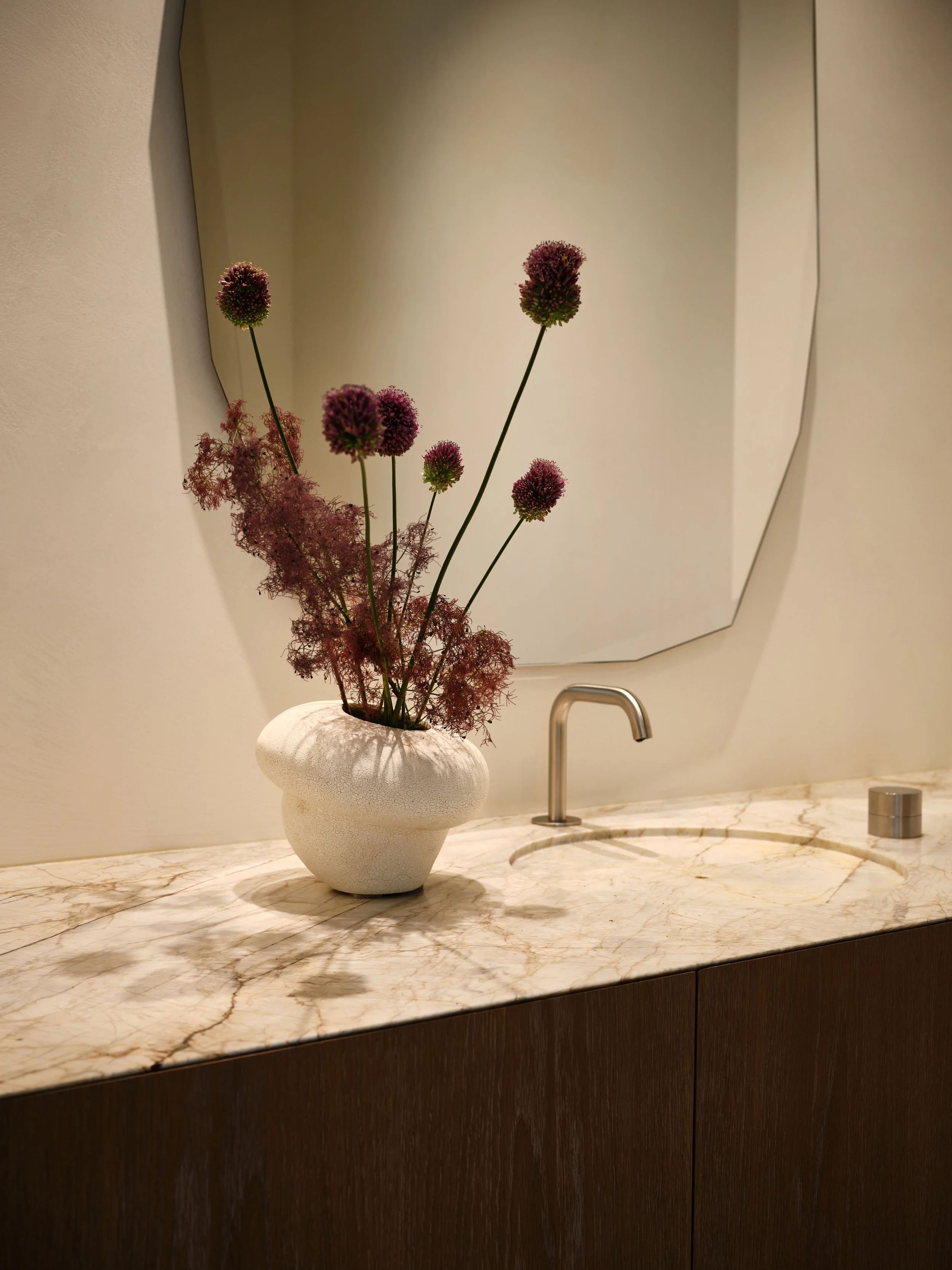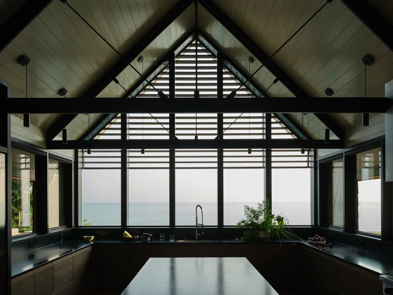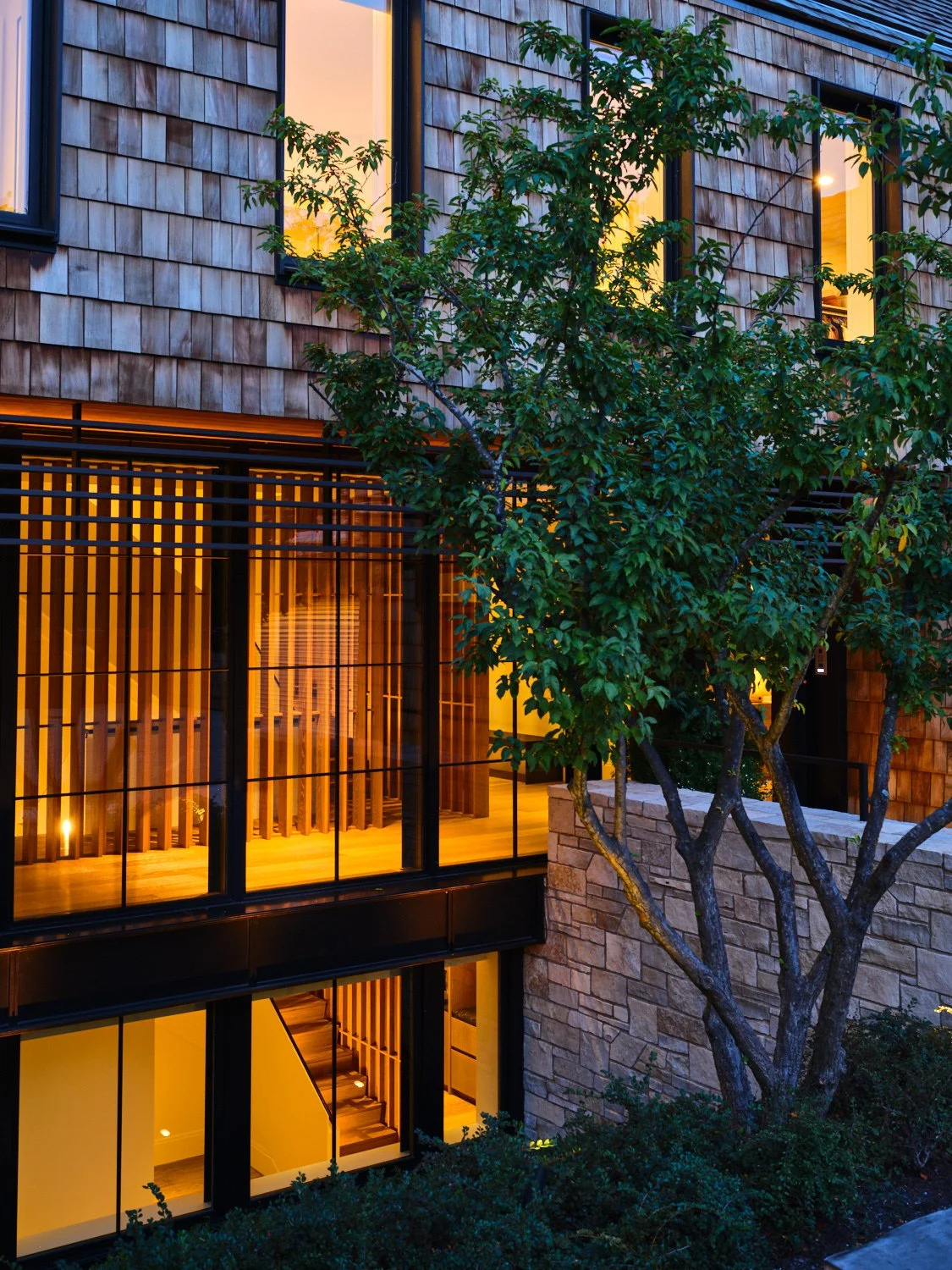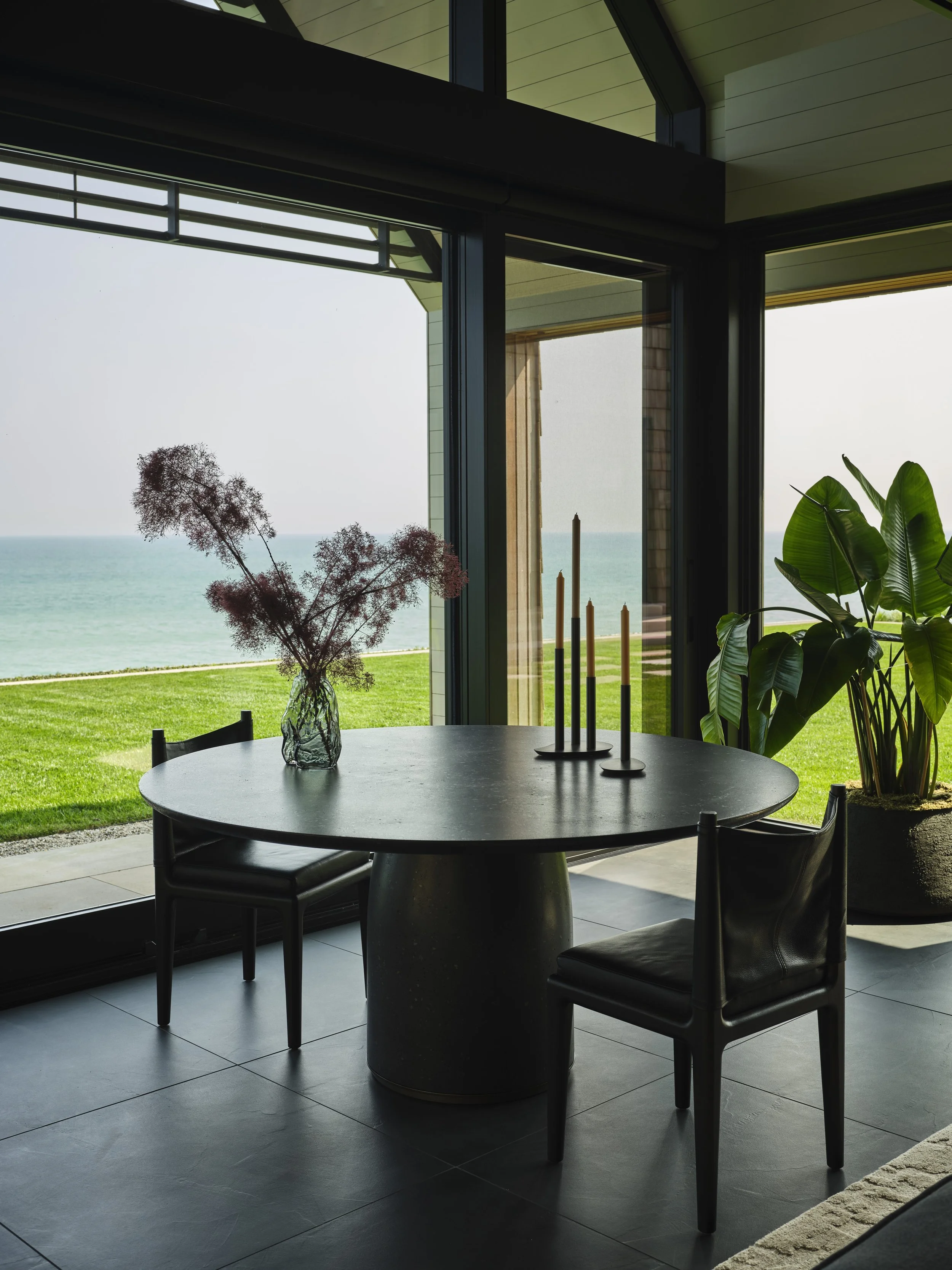The material palette was kept intentionally modest - common oak, cold rolled steel, western red cedar, painted lap siding, patinated zinc, simple yet resilient ceramic and porcelain. These materials were then combined and detailed with careful intent, befitting the character of the home. That said, the details and materials speak softly to avoid overshadowing the magnificent land and water beyond.The home’s classic gables and shingle style skin recognize neighboring landmark estates designed by the likes of David Adler, Robert Seyfarth, and Charles Bernard Shaw. With that historic acknowledgment established, a series of gestures such as a pair of chimneys that boldly slash through the principal roof subvert convention, firmly planting the house in the contemporary age.